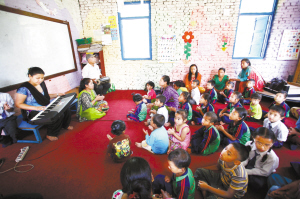 尼泊爾學校復(fù)課 5月31日,在尼泊爾的巴克塔普爾,復(fù)課的學生們接受音樂治療。據(jù)尼泊爾當?shù)孛襟w報道,尼泊爾教育部已經(jīng)宣布,全國14個地震受災(zāi)縣的學校將于5月31日復(fù)課。新華社發(fā)