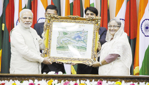 印度和孟加拉國(guó)簽署多項(xiàng)文件加強(qiáng)合作      6月6日,在孟加拉國(guó)達(dá)卡舉行的新聞發(fā)布會(huì)上,孟加拉國(guó)總理哈西娜(右)向印度總理莫迪贈(zèng)送電站項(xiàng)目效果圖。孟加拉國(guó)總理哈西娜6日與正在孟加拉國(guó)訪(fǎng)問(wèn)的印度總理莫迪舉行會(huì)談,兩國(guó)當(dāng)天簽署多項(xiàng)文件加強(qiáng)合作。新華社發(fā)