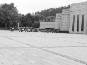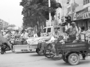 圖①  周口師范學院大門前又見排成一行的“紅頂三輪車”在從事非法營運,沒人進行管理。