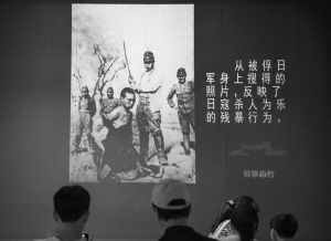 日軍虐待和殘殺戰(zhàn)俘的罪行,也展示在主題展覽中。有一組照片來自美國《生活》雜志,照片顯示日軍軍官先用劍刺殺一名中國戰(zhàn)俘,隨后,日軍士兵用刺刀繼續(xù)進行“刺殺練習(xí)”,其殘忍和野蠻令人發(fā)指。