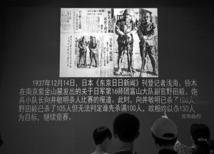?、?nbsp;7月12日,觀眾在中國人民抗日戰(zhàn)爭紀(jì)念館觀看1937年12月14日,日本《東京日日新聞》記者淺海、鈴木在南京紫金山麓發(fā)出的關(guān)于日軍第16師團富山大隊副官野田毅、炮兵小隊長向井敏明殺人比賽的報道。