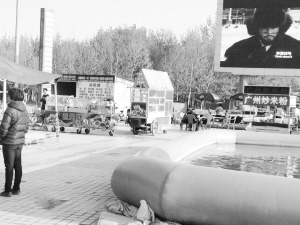 4月8日18時(shí)許,記者在現(xiàn)場(chǎng)看到,廣場(chǎng)的中央噴泉東側(cè)擺了許多攤點(diǎn),有的攤點(diǎn)甚至把桌椅擺到了人行道上(如圖)。在廣場(chǎng)東側(cè)的出入口處,一些賣飯的商販已經(jīng)將桌椅擺放整齊,不寬的道路被占去近一半。