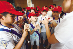 小記者們按照要求學(xué)起四指點(diǎn)鈔法,可手指怎么也不聽(tīng)使喚。銀行的阿姨告訴他們竅門:先將一沓點(diǎn)鈔紙彎成扇形,然后每根手指撥動(dòng)一張點(diǎn)鈔紙。很快,小記者們就熟練了許多。
